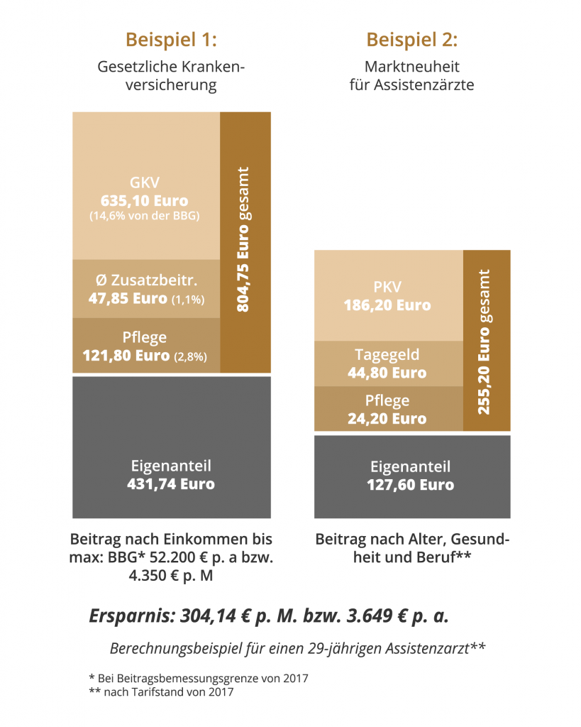 Bis zur Anerkennung als Facharzt zahlen Sie gerade einmal um die 100,- Euro Eigenanteil für die Krankenversicherung statt ca. 400,- Euro in der GKV. Danach, als Facharzt lohnt sich die private Krankenversicherung immer noch.